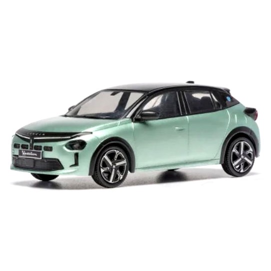 IXO 1:43 diecast model of the 2025 Lancia Ypsilon in green/black. Lancia introduced the fourth-generation Ypsilon in 2024. It was the Italian car manufacturer's first new model in over a decade.