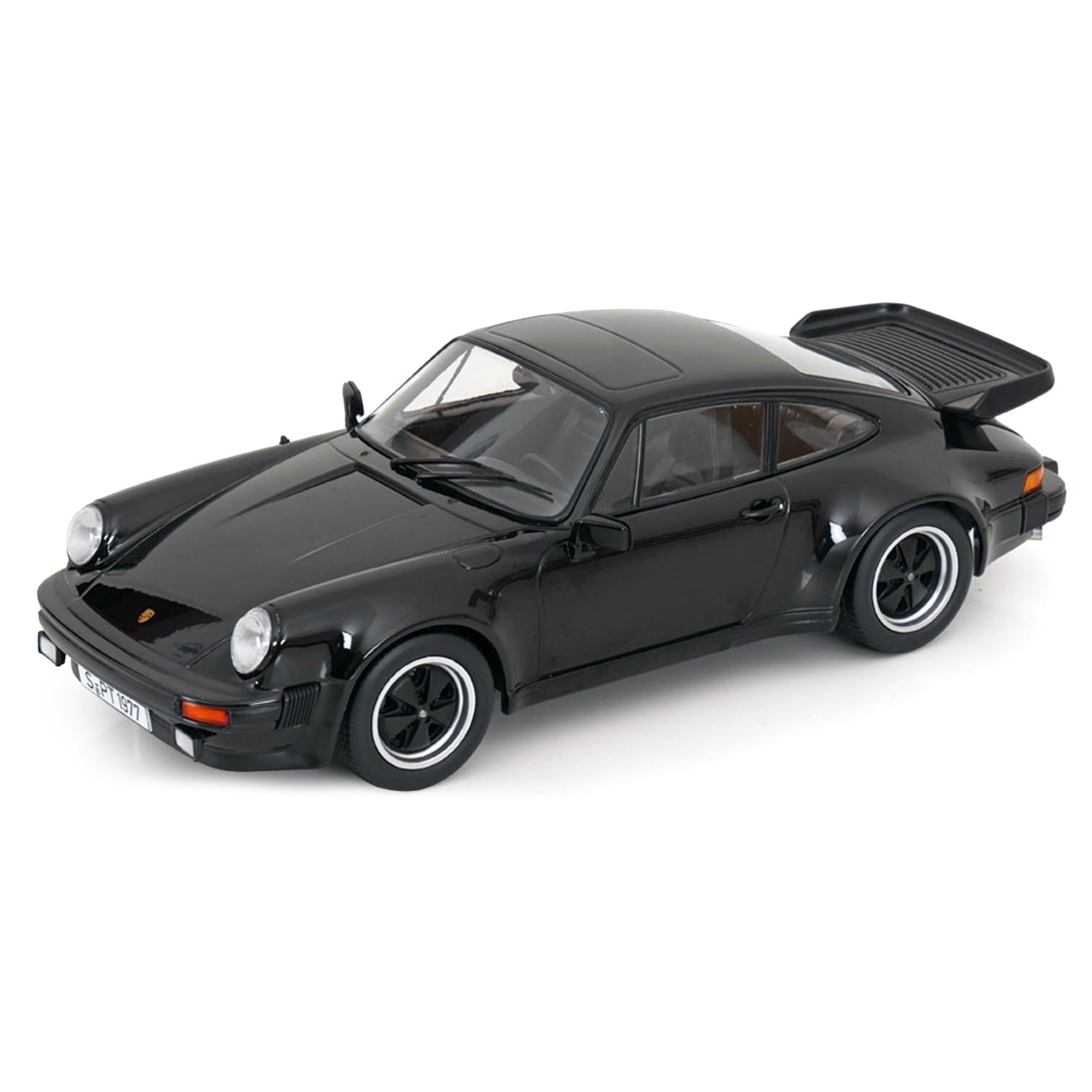 KK 1:18 diecast model of the 1977 Porsche 911 (930) Turbo 3.3 in black. The 930 represented the turbocharged variant of Porsche's 911. It was built from 1975 to 1989. It was the top-of-the-range 911 model for its entire production run, and at the time of its introduction it was the fastest production car in Germany.