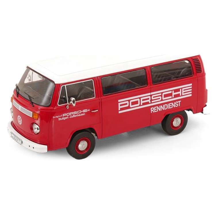 KK 1:18 diecast model of the 1972 Volkswagen T2B Bus in a Porsche servicing livery of red/white. The T2B was the 'bay window' version of VW's classic Type 2 Transporter. It was mainly distinguished by its large, single-piece windscreen.
