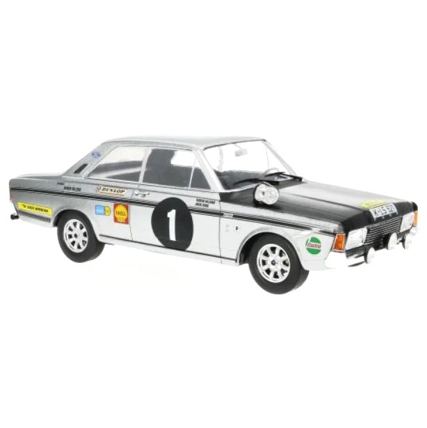 MCG 1:18 diecast model of the #1 Ford Taunus 20M RS as driven to victory by Robin Hillyar in the 1969 Safari Rally. The Kenyan reached the end of the event with just over half an hour in hand over his nearest competitor.