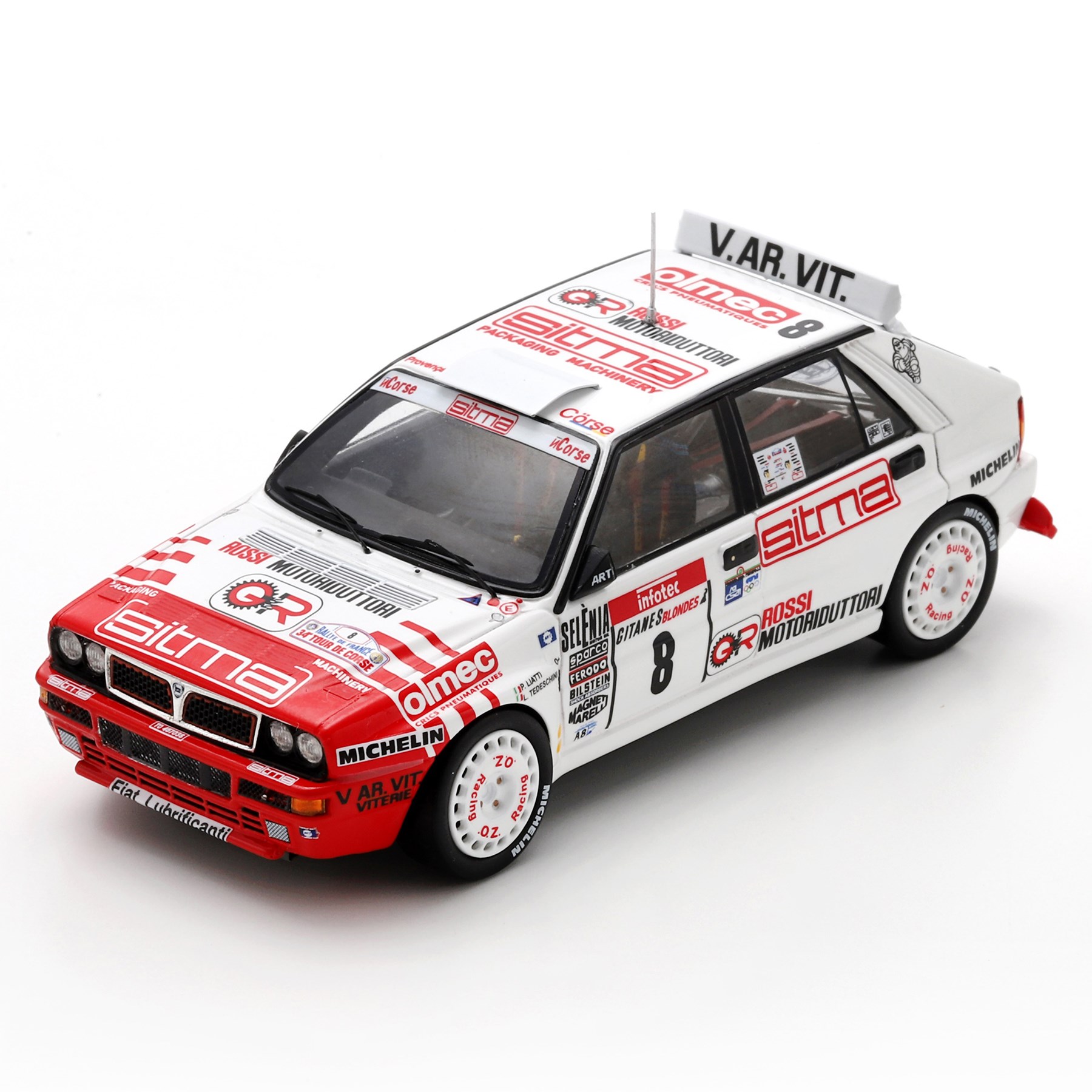 Spark 1:43 resin model of the #8 Lancia Delta HF Integrale as driven by Piero Liatti in the 1992 Rally France. The Italian reached the end of the event in eighth place.