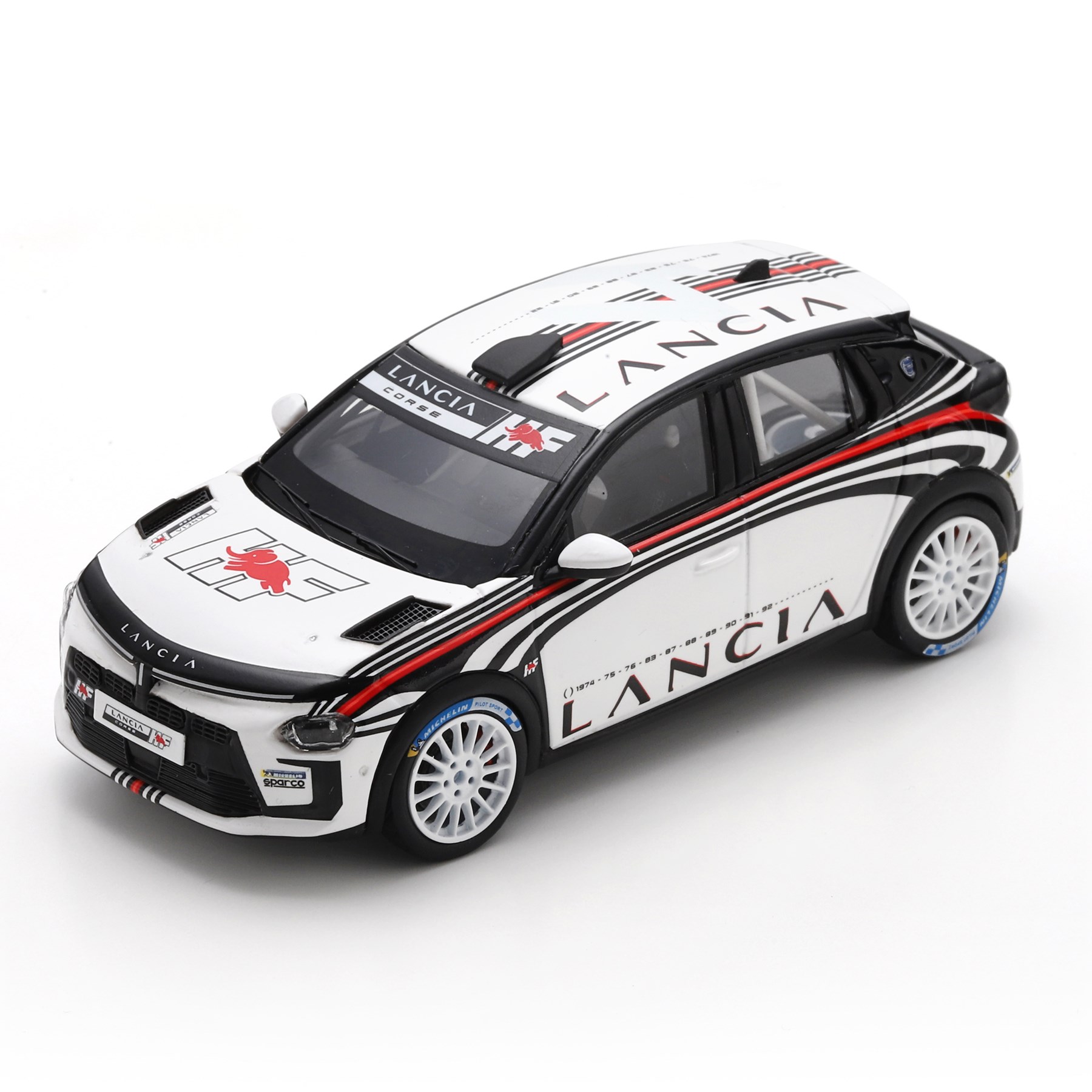 Spark 1:43 resin model of the 2025 Lancia Ypsilon Rally4 presentation car with red/black stripes. The Ypsilon represented Lancia's much-celebrated return to rallying competition.