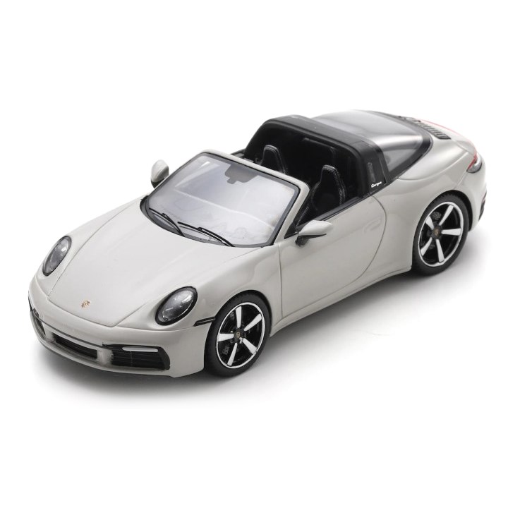 Spark 1:43 resin model of the Porsche 911 Targa 4S in Chalk Grey. As with all of Porsche's Targa models, the 4S features a removable roof section. It is powered by a twin-turbo flat-six engine, allowing it to accelerate from 0 to 62 mph in just 3.5 seconds.