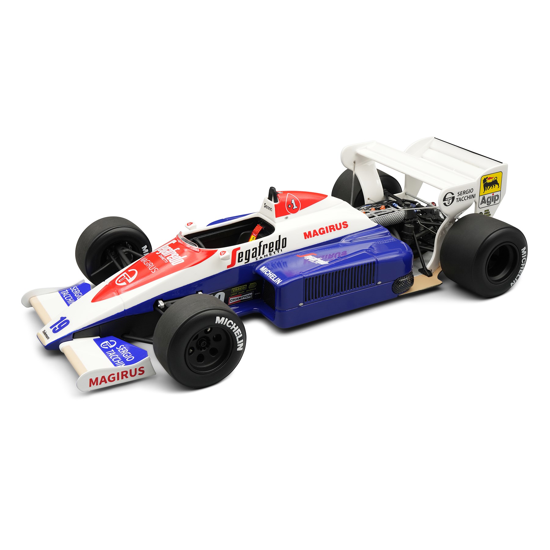Tecnomodel 1:18 resin model of the #19 Toleman TG184 as driven by Ayrton Senna in the 1984 British Grand Prix. The future Formula One legend finished third, scoring the second podium of his rookie season. Display case included.